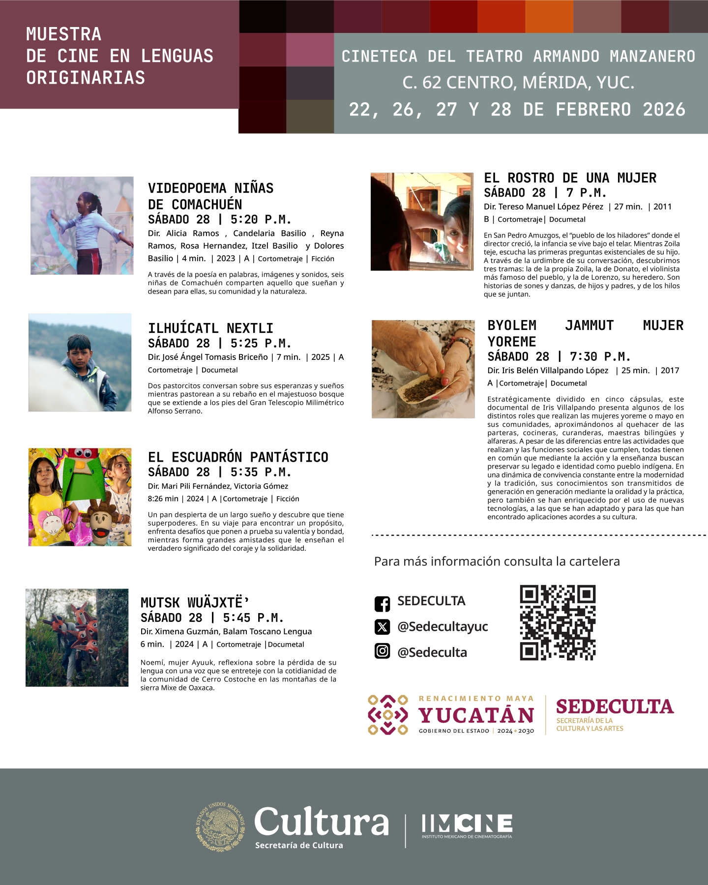 Mérida, Yuc., a 25 de febrero 2026.- La Secretaría de la Cultura y las Artes de Yucatán (Sedeculta), en colaboración con el Instituto Mexicano de Cinematografía (IMCINE), presenta en la Cineteca del Teatro Armando Manzanero la Muestra de Cine en Lenguas Originarias, con proyecciones completamente gratuitas.