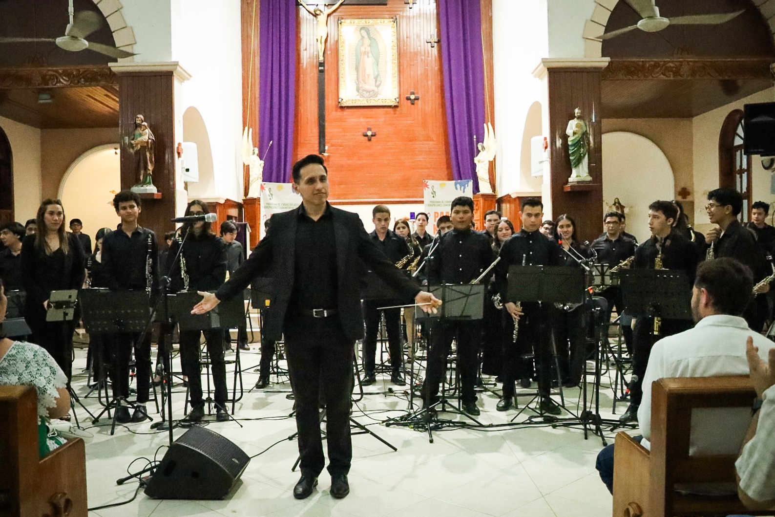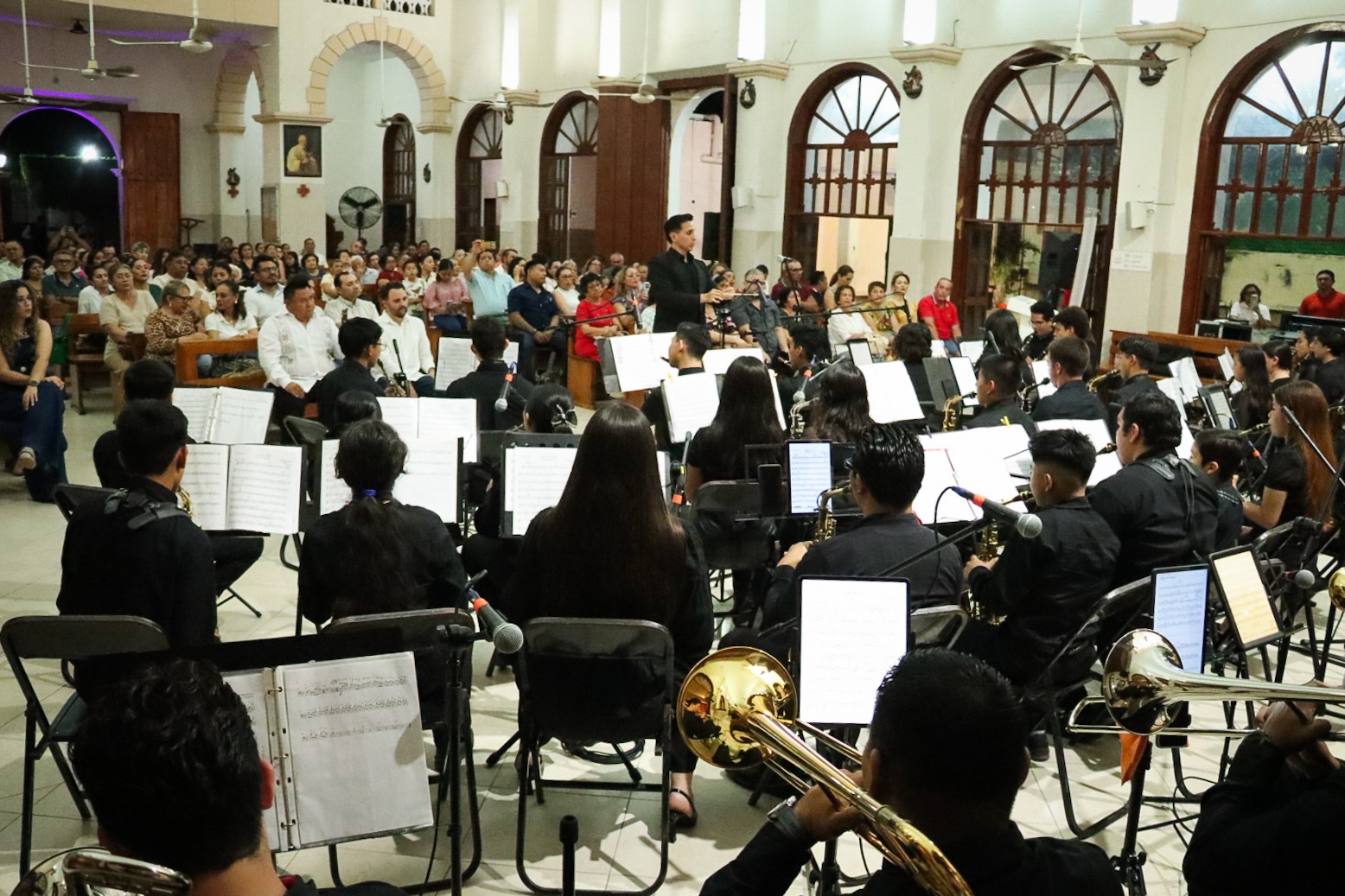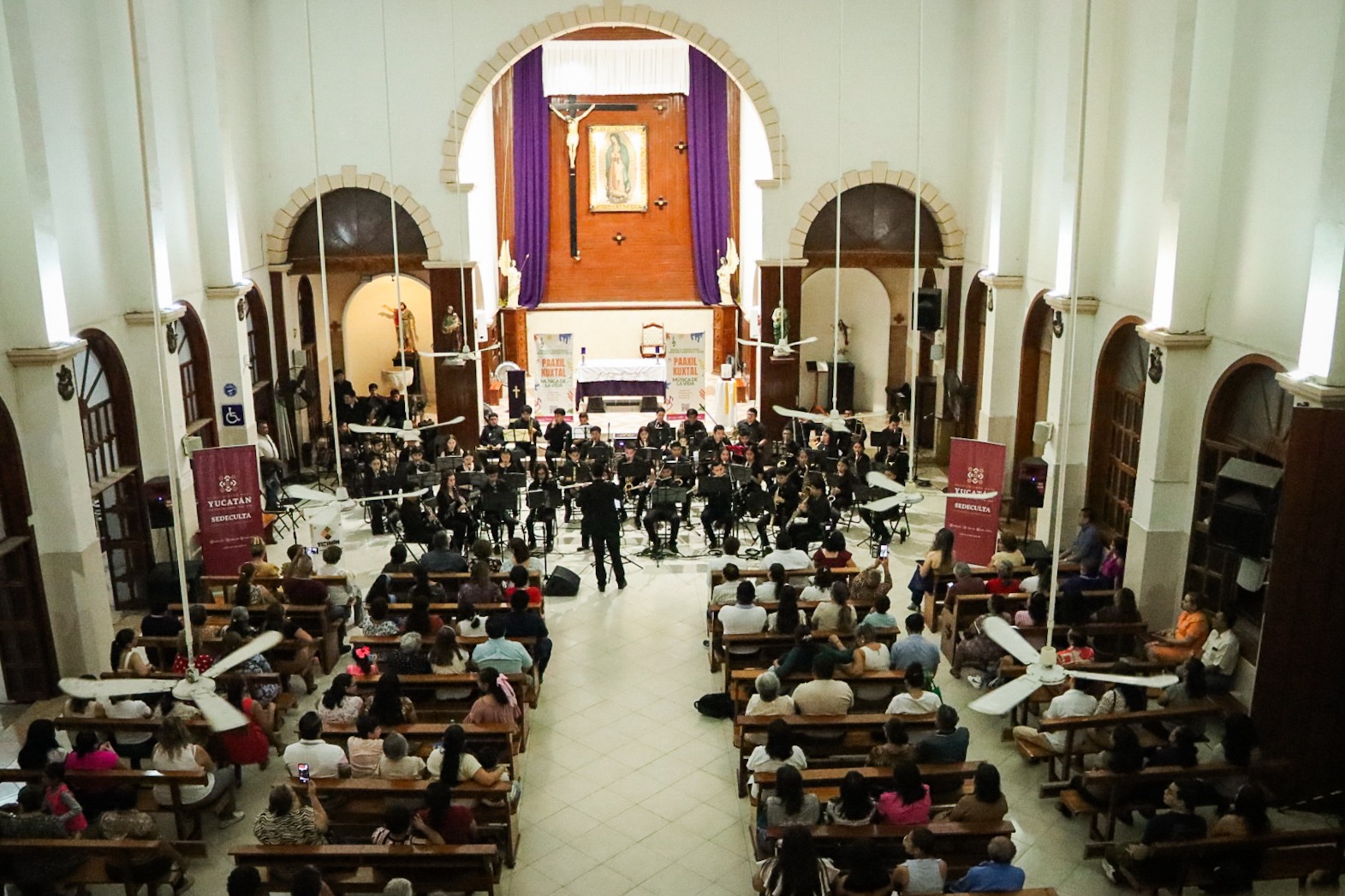 Tizimín, Yucatán, a 14 de marzo de 2026.- Bajo las bóvedas de la parroquia de Nuestra Señora de Guadalupe, el silencio de la noche se transformó en música. La Banda Sinfónica Infantil y Juvenil de Tizimín inauguró su ciclo de conciertos 2026 con "De vuelta a lo clásico", como parte del programa Paaxil Kuxtal: Música para la Vida, que impulsa la Sedeculta, que lleva educación musical al interior del estado.