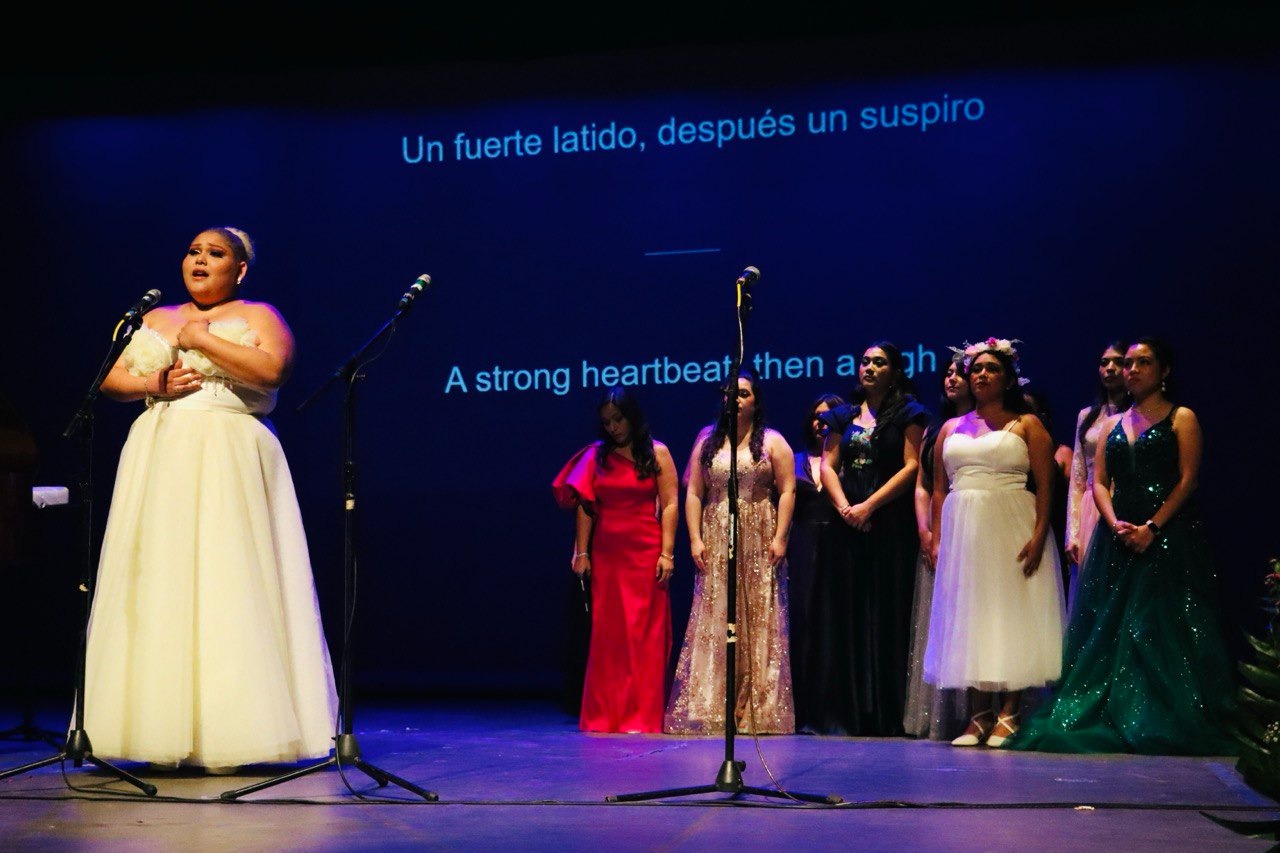 Los temas fueron interpretados por las educadas voces de Andrea Gutiérrez, Naomi Cuellar, Paola Parra, Mariana Palma, Claudia Carrillo, Andrés García, Martín Luna, Marcela Echeverría, Mariana Farfán, Teresa Canto, Andrea Poot y Graciela Gómez, que demostraron, una vez más, el talento vocal que hay en Yucatán.