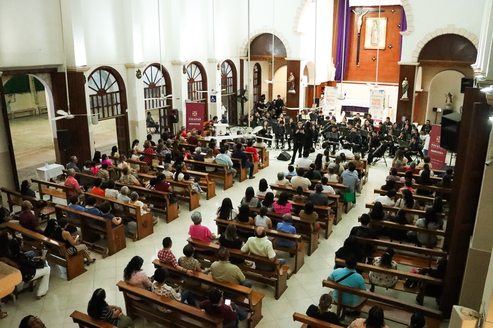 Tizimín, Yucatán, a 14 de marzo de 2026.- Bajo las bóvedas de la parroquia de Nuestra Señora de Guadalupe, el silencio de la noche se transformó en música. La Banda Sinfónica Infantil y Juvenil de Tizimín inauguró su ciclo de conciertos 2026 con "De vuelta a lo clásico", como parte del programa Paaxil Kuxtal: Música para la Vida, que impulsa la Sedeculta, que lleva educación musical al interior del estado.
